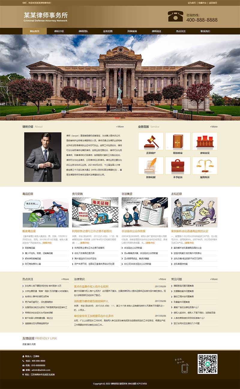 PbootCMS内核开发的网站模板,该模板适用于法律资讯网站、律师事务所网站等企业,当然其他行业也可以做,只需要把文字图片换成其他行业的即可; 自适应手机端,同一个后台,数据即时同步,简单适用!附带测试数据! 友好的seo,所有页面均都能完全自定义标题/关键词/描述,P