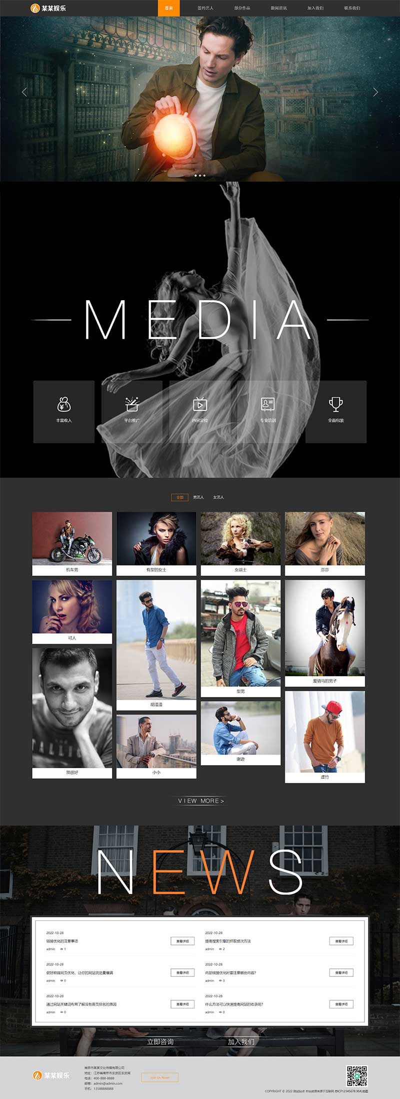 PbootCMS内核开发的网站模板,该模板适用于文化传媒网站模板、娱乐主播网站模板、直播培训网站源码等企业,当然其他行业也可以做,只需要把文字图片换成其他行业的即可; 自适应手机端,同一个后台,数据即时同步,简单适用!附带测试数据! 友好的seo,所有页面均都能完全自