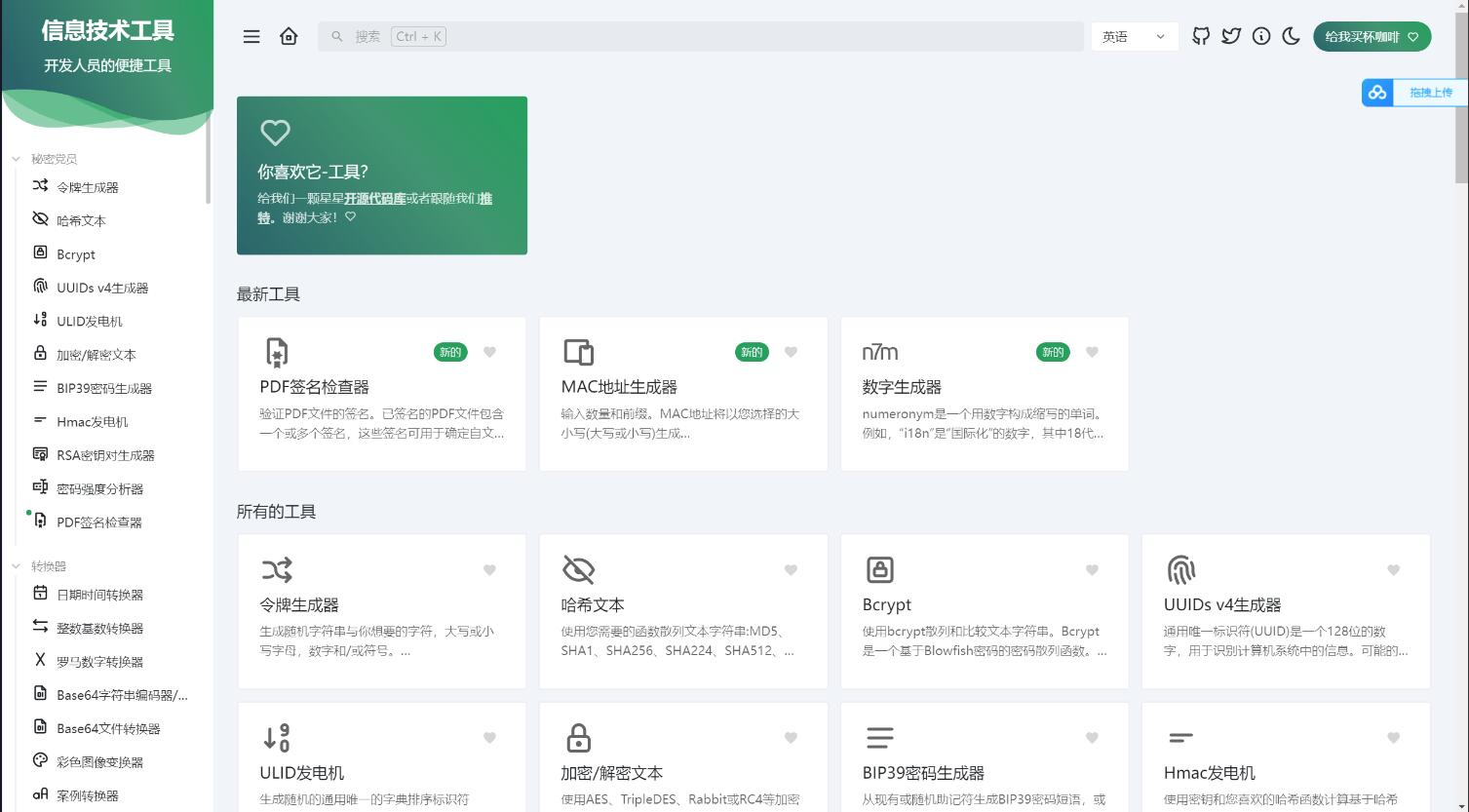 IT Tools是一个免费且全面的在线工具集合,为开发人员和IT工作人员提供了极其实用的工具。目前,收录的工具类型包括加密货币、转换器、网络工具、图片视频工具、数学工具等等。这个在线工具集合不仅提供出色的用户体验,而且还是开源的。