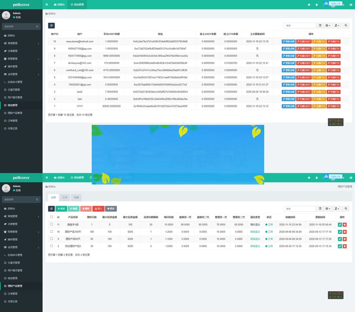 服务器打包的双语言区块链定期活期理财系统,USDT理财,web和wap自适应。(无教程) 注册奖 -直推奖-管理奖 注册奖-注册成功后奖励多少U 直推奖-直推的下线充值购买了理财后奖励百分之多少 管理奖-推荐的下线购买的理财后产生利息,每天有奖励 后台地址:域名 /backend
