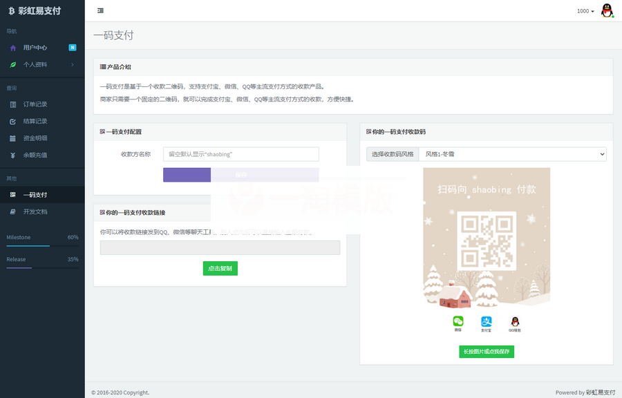 亲测 源码介绍: 此版本为彩虹易支付原作者二开版本,新加了很多功能, 新功能:API退款,轮训支付,网银支付,京东支付, 实名认证更多功能自己登录演示后台 再带11套首页模板, 比原版不知道好用多少,犹豫本人这短时间一直在国外无法搭建演示测试,但是这个精品必须搭建了!