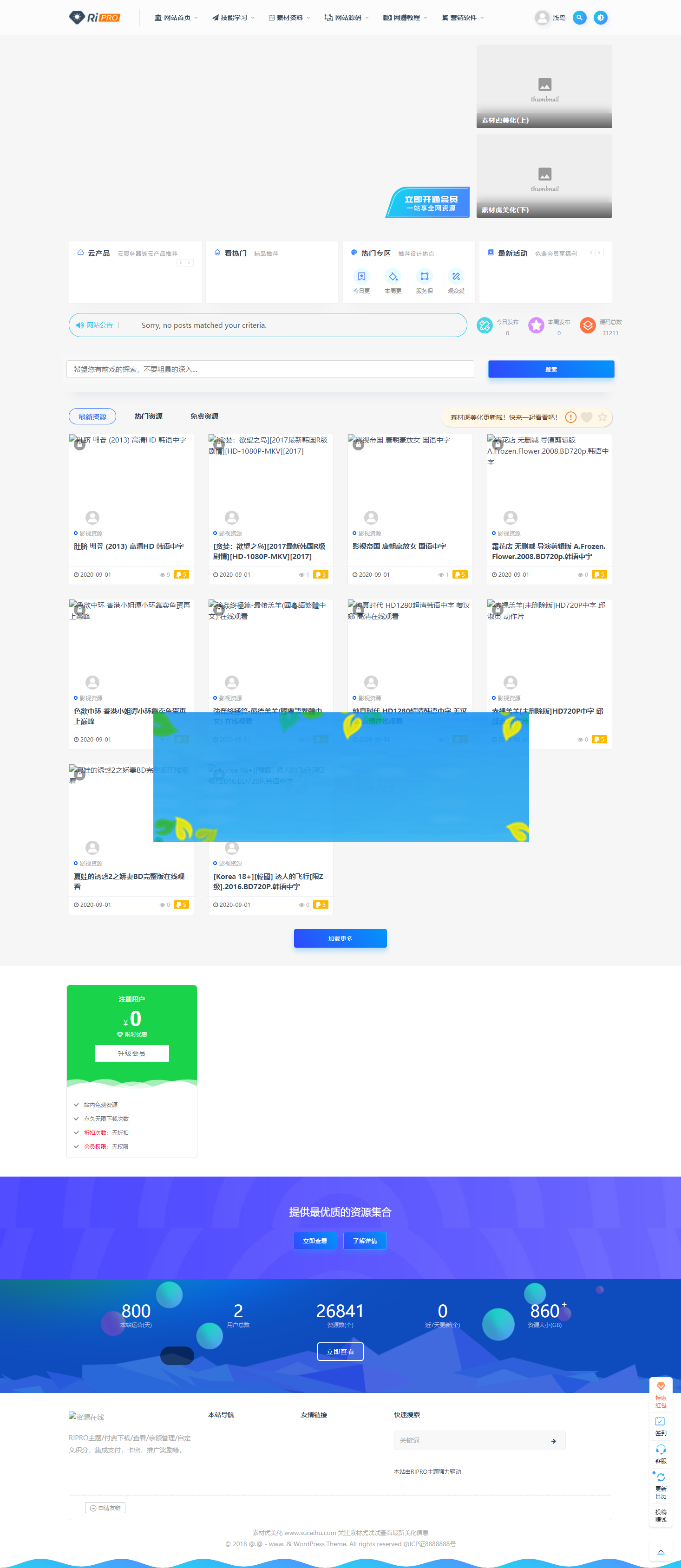 还不错自带了RiPRO主题,包含素材资料,网站源码,网赚教程,营销软件,软件工具,技能学习等5大分类,