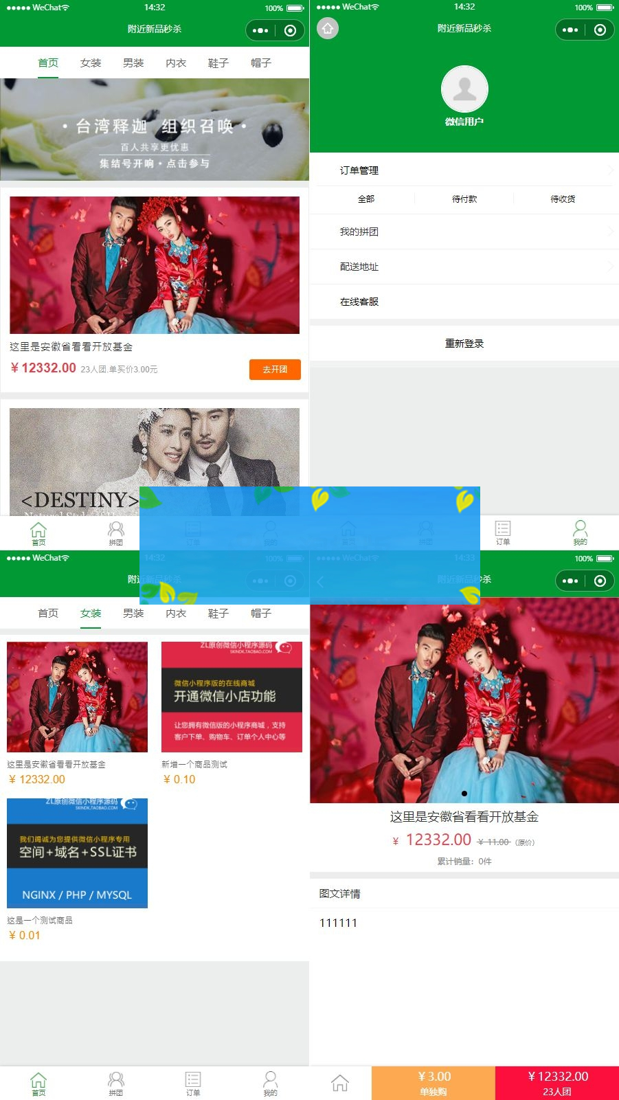 Thinkphp内核开发的微信拼团购物商城小程序源码,支持微信支付,一淘模板小编亲测完美。