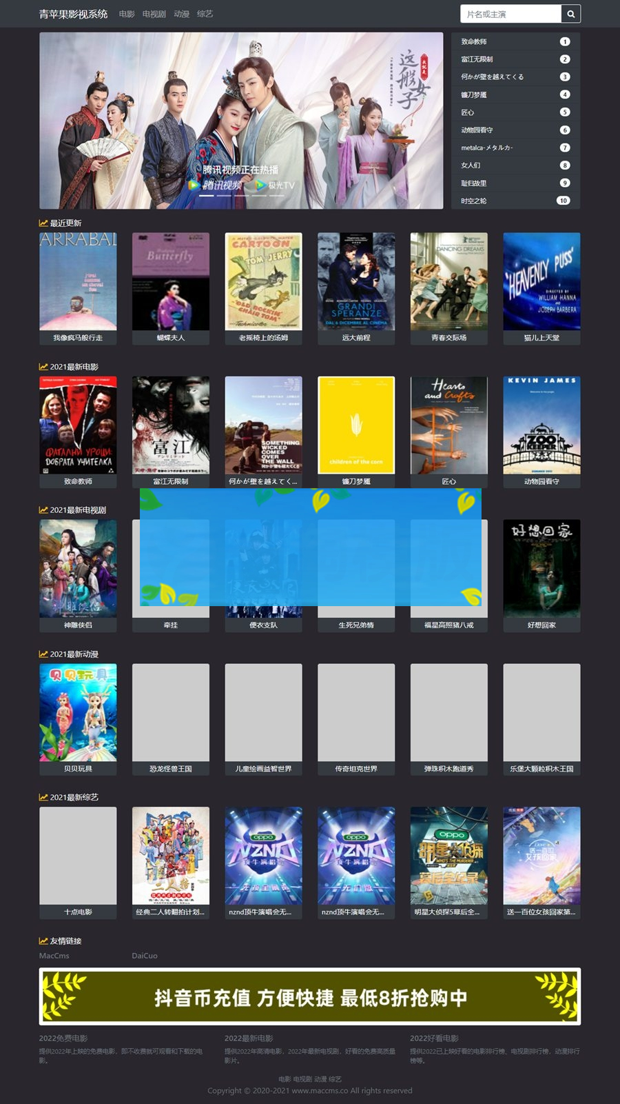 功能列表 1、数据模块 –一键对接市面上的影视资源站API接口、现已支持FeiFeiCms、MacCms、MaxCms、SeaCms等常用的影视CMS接口。 2、自适应模板 –系统支持一套模板自适应电脑、手机、平板、公众号等多个终端入口,也可以独立设置移动端与PC端模板分离。 3、点播模