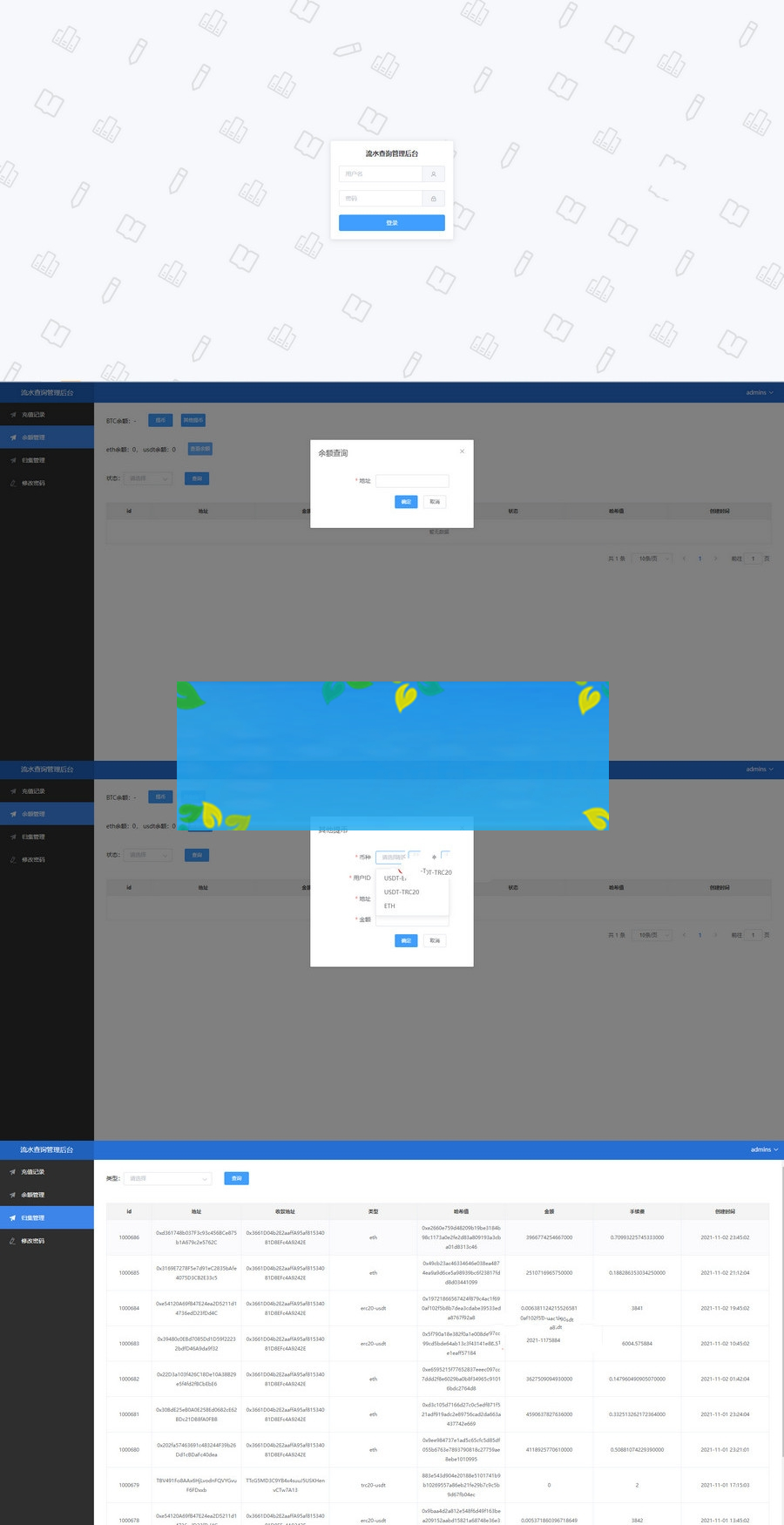 二开版流水查询系统/虚拟币查询多方式提币系统系统单独二开了提币,支持USDT-ERC20、USDT-TRC20、ETH方式提币支持单独地址余额查询,注意的是系统查询的API应该是对接第三方,现在不清楚能不能用了源码自行研究