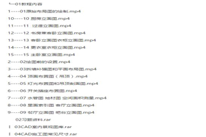 │课程目录: │ └─01教程内容 1—-01原始布局图的绘制.mp4 10—-10 厨房立面图.mp4 11—-11 过道立面图.mp4 12—-12 书房兼客卧立面图.mp4 13—-13 客卧立面图衣柜立面图.mp4 14—-14 更衣室衣柜立面图.mp4 15—-15 主卧室立面图.mp4