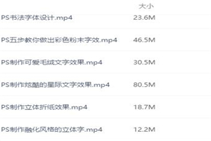 PS贪玩蓝月字体设计.mp4 PS水彩字设计.mp4 PS制作立体折纸效果.mp4 PS制作可爱毛绒文字效果.mp4 PS双十一全球狂欢节光效字体.mp4 PS视达网文字设计.mp4 PS视达火焰字字
