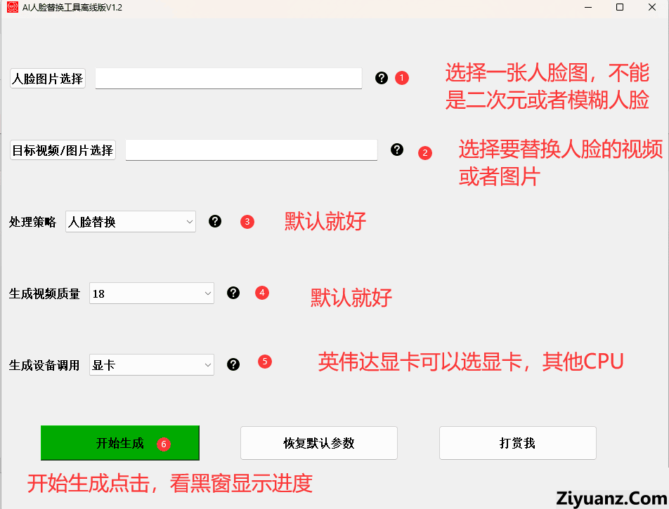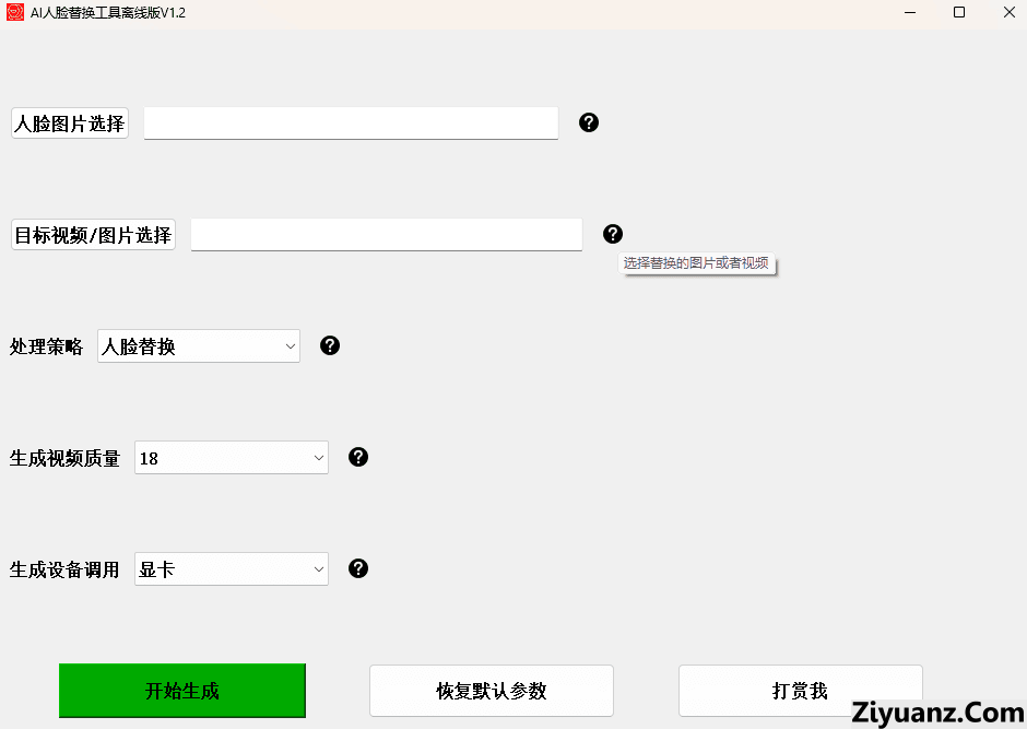 简介: AI换脸替换工具离线版V1.2。基于开源项目,做了如下的小工具,给定一张人脸图,即可实现将某视频或者图片的人脸替换成给定的人脸。 软件操作依然很简单,鼠标悬停问号都有解释。 配置要求 1、软件解压就能用,支持CPU和显卡跑,显卡需要英伟达显卡,目前测试16G内存下