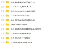 资源内容: 7.1-数据抓取工具及爬虫相关库 7.2-数据解析的三种方式 7.3-Scrapy框架入门 7.4-Scrapy框架进阶 7.5-实战新片场爬虫 7.6-Scrapy-Redis的应用