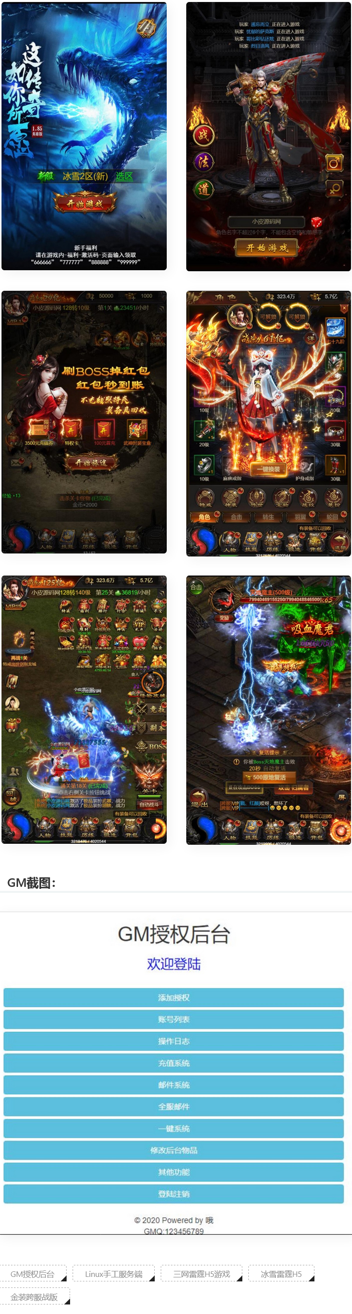 三网雷霆H5游戏【冰雪雷霆H5金装跨服战版】最新整理Linux手工服务端+跨服+多区+GM授权后台