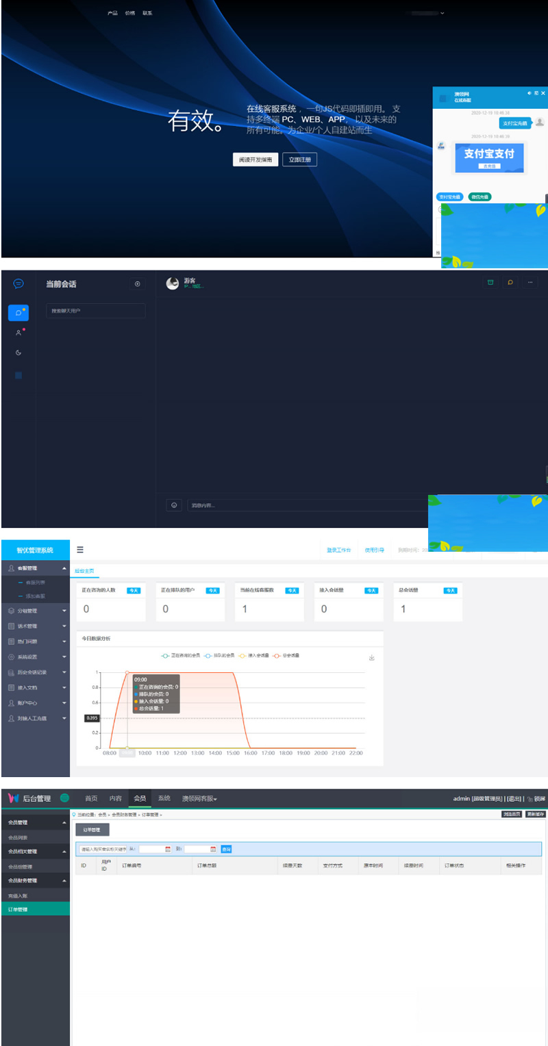 客服转接、历史消息查看、数据统计、来源追踪、问候语、桌面通知、夜间模式切换