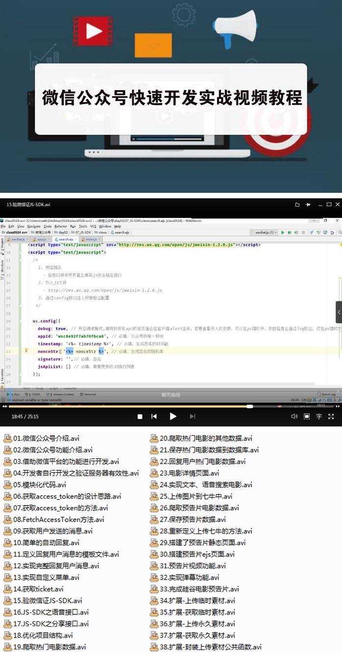 本套微信公众号开发视频教程,共38讲,课程主要是讲解微信公众号基础知识介绍;微信公众号的开发相关知识;微信公众号的交互流程;微信公众号JS-SDK开发实战案例分享。附课程源码。