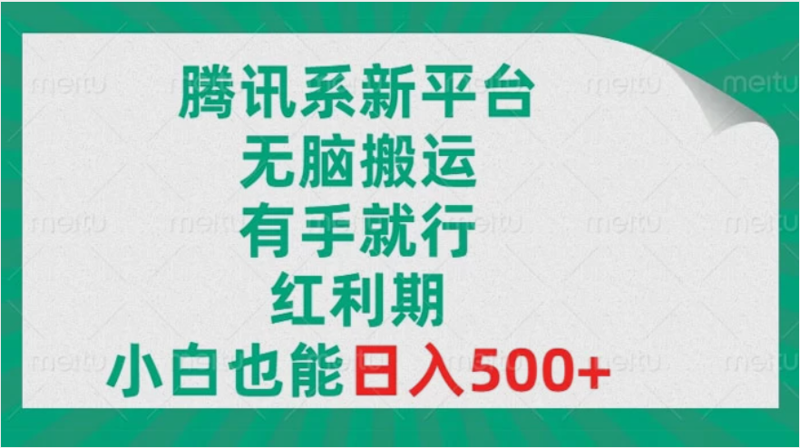 项目介绍 今天给大家带来的项目是《腾讯系新平台,无脑搬运,蓝海赛道,有手就行,小白也能日入500+》 课程目录 第一节:项目介绍; 第二节:前期准备; 第三节:实操过程; 第四节:变现方式;